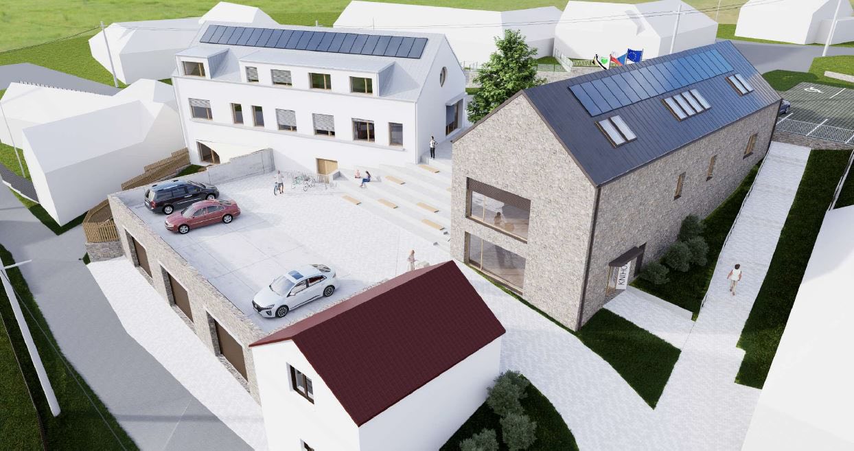 Staveniště předáno, práce započaly. Do 18 měsíců bychom měli převzít: budovu služeb(ta bílá) obsahující: 4 byty (dotačně podpořil SFPI), 2 ordinace pro zubní lékaře, 1 ordinaci pro praktického lékaře a 1 budovu nového obecního úřadu (kanceláře, zasedací sál, knihovnu, poštu, coworkingové prostory v odkroví) Architektonický návrh D+Architekti s.r.o.