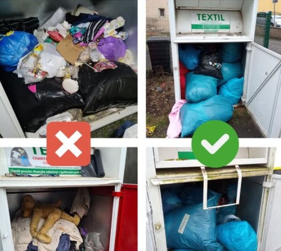 Textil do kontejnerů v igelitových pytlích 03.10.2025 13:31 Svozová společnost ESKO-T prosí občany, aby textil dávali do kontejneru zabalený v zavázaných igelitových pytlích. Je to z důvodu snadnější manipulace při jeho ručním vyprazdňování a také jako ochrana před jeho znečištěním.