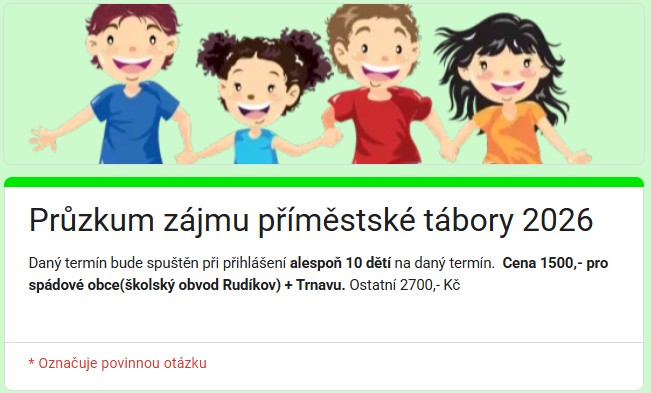 Zjišťování zájmu o příměstské tábory v létě 16.01.2026 08:25 Máte-li zájem letos zase využít pro děti příměstské tábory při ŽS Rudíkov, můžete zde vyplnit formulář